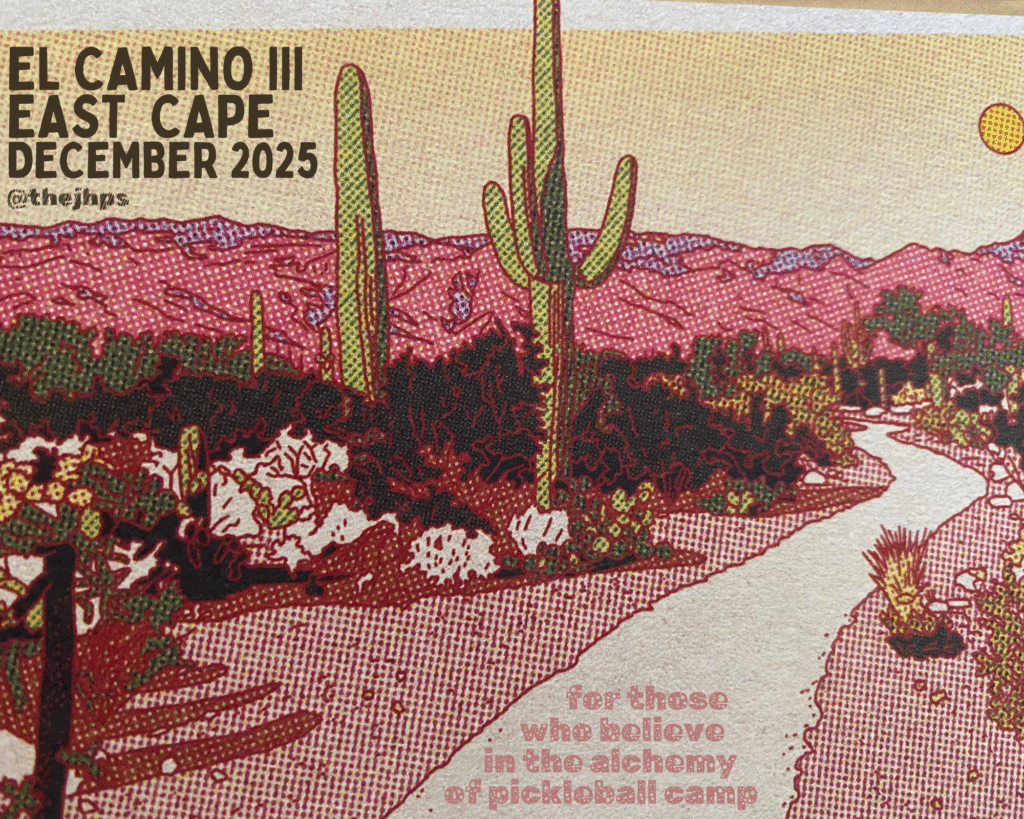 El Camino is a pickleball camp for those who believe there should be a little alchemy in something called pickleball camp. (But you’ll enjoy the absurdity of it too.) It’s for those who believe a cleft of saguaro cacti has something real to show us about ready position, and that sand dunes might unlock our latent understanding of the transition zone. It’s for those who believe in both journey and path—and the infinite possibility of the Baja coast.